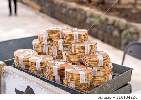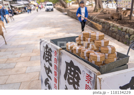 鹿せんべい屋の周りで待機する奈良公園の鹿