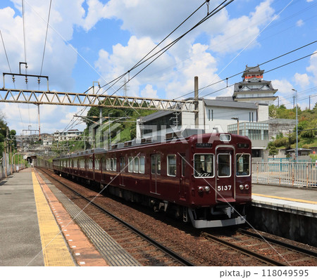能勢電鉄一の鳥居駅に停車する5100系電車