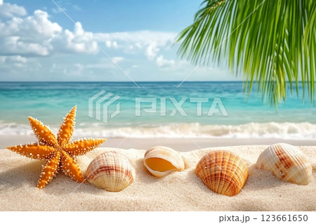Tropical beach with various shells in sand, copyspace for text. Concept of summer relaxation