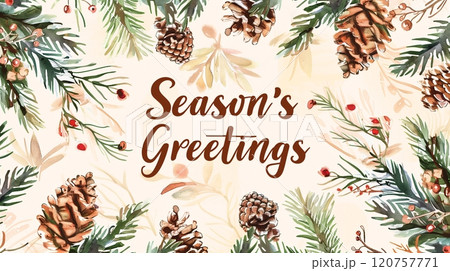 A rustic-themed Christmas card featuring the text 'Season's Greetings' in earthy tones, decorated with pine cones, evergreen branches, and warm, cozy colors. AI generated.