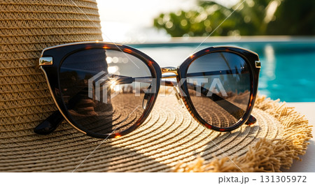 Stylish Sunglasses on a Straw Hat by a Pool in Summer
