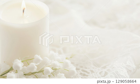 White ceremonial candle surrounded by delicate lilies of the valley flowers, symbol of christening