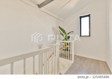 A bright modern interior showcasing a stylish staircase and a potted plant, complemented by ample natural light streaming through a window.