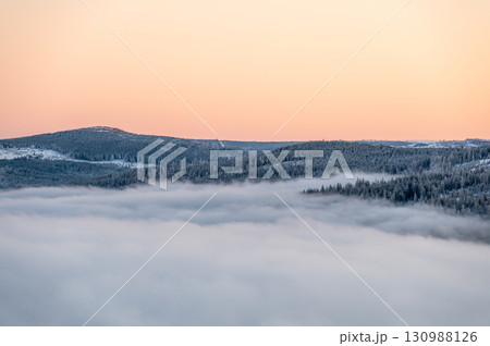 Winter inversion sunset with snow covered hills and forests rising above a sea of clouds, captured from above, with warm evening light painting the sky in glowing tones.