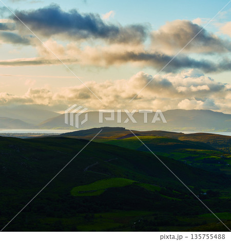 Rolling green hills lead to Castlemaine Harbour with hazy mountains under a dramatic sky. Golden light illuminates the clouds and parts of the landscape during a serene evening.