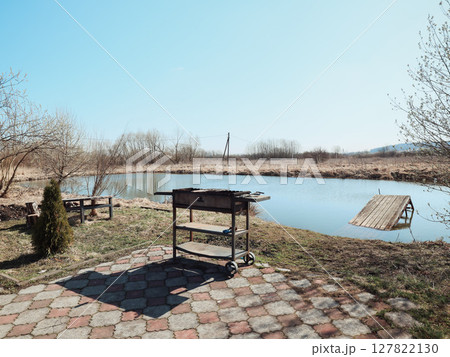 A Scenic and Inviting Outdoor Barbecue Area Nestled by a Tranquil and Serene Pond