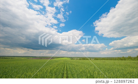 A Vast and Beautiful Field Spreading Under the Blue Sky with Fluffy Clouds Above It