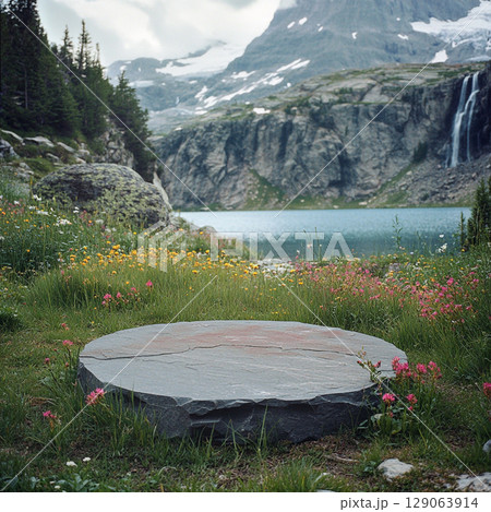 A rustic round stone sits amidst wildflowers, with a pristine lake and a towering waterfall backed by majestic mountains and evergreen trees in the distance.