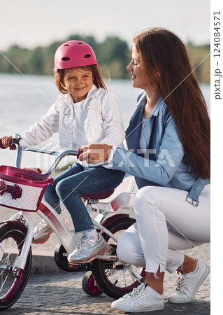 Having fun together. Mother with her young daughter is with bicycle outdoors together