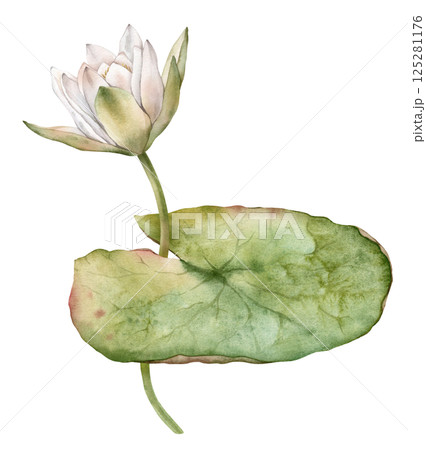 Flower Water Lily with green leaf. Hand drawn watercolor illustration of lakewhite waterlily on isolated background. Composition with lotus. Beautiful chinese water lily for design