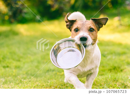 Hungry or thirsty dog fetches metal bowl to get feed or water