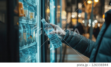 Person buying bottled water from vending machine at night. Urban lifestyle scene with blue neon lighting and convenience shopping in city environment