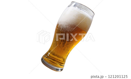 A tall glass of golden beer with a frothy head, tilted on a white background