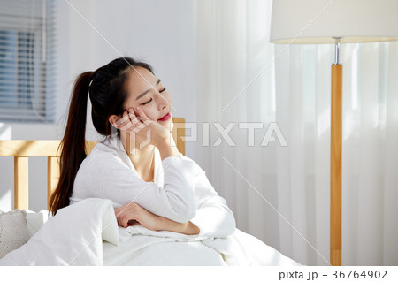 침대에서 행복한 여유를 즐기고 있는 20대 여자