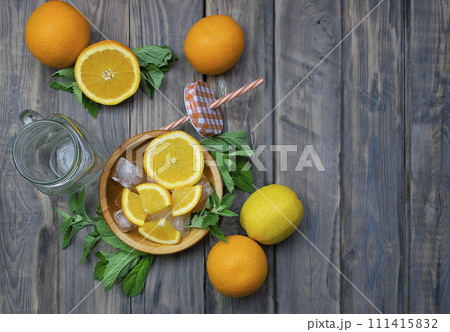 composition with fresh orange , mint, lemons closeup. Fresh natural drink and fruits.