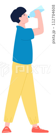 Young Man and Woman Standing and Drinking Pure Still Water from Plastic Bottle Quenching Thirst Vector Set