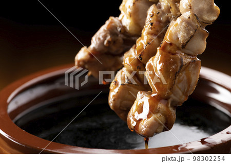 鶏のモモ肉の串焼きをタレ壺の中の焼き鳥のタレに漬ける