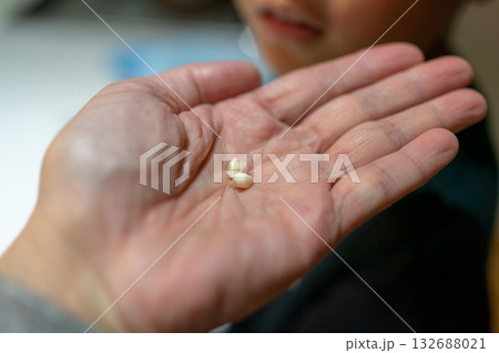 抜けた乳歯を見せる子供手元