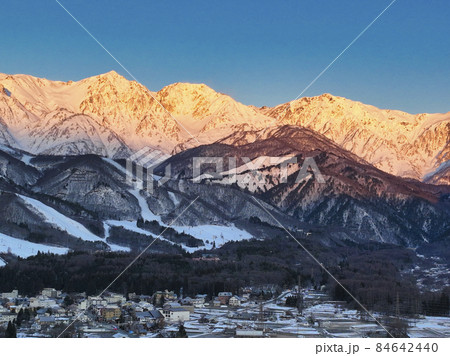 朝日に染まる白馬三山と八方尾根スキー場と旅館街 長野県白馬村(ドローンによる空撮)