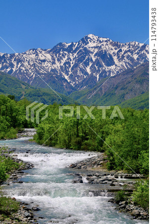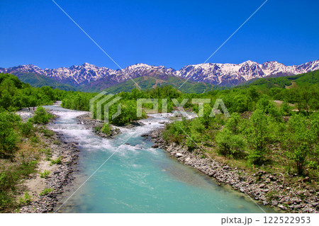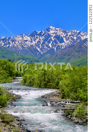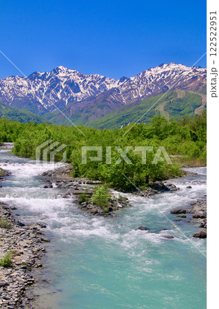 長野県白馬村 姫川上流の松川の清流と初夏の五竜岳~白馬三山遠望