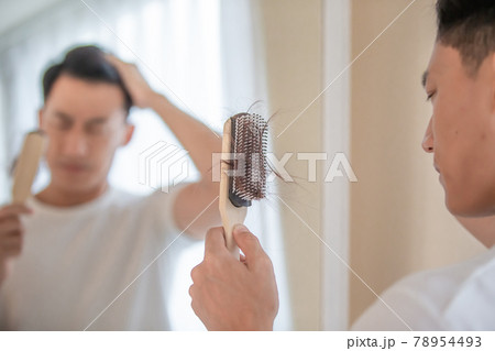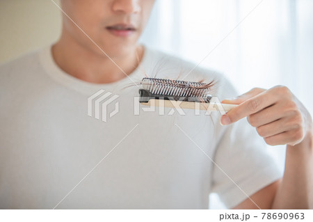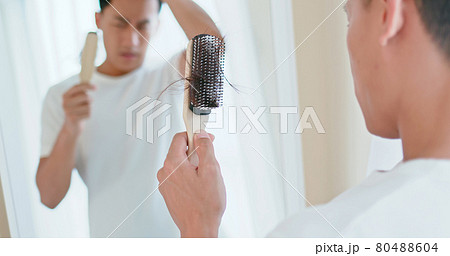 Portrait Asian man with worry feeling and touching on his head to show bald head or Glabrous problem. Studio shoot with copy space with grey
