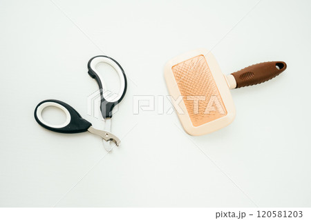 Flat cartoon collection of pets and items for pet home care. Dogs, cats and parrots with grooming tools and supplies. Daily hygiene, feeding, walking and playing accessories vector illustrations set