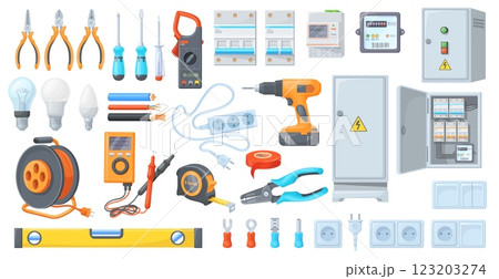Cartoon electrician tools. Electricity repair work tool, electric power energy service set plug wire cable screwdriver socket electronics meter switcher, neat vector illustration