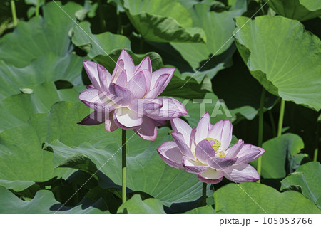 爽やかな青空の下穏やかに咲く蓮の花 夏の蓮池 古河