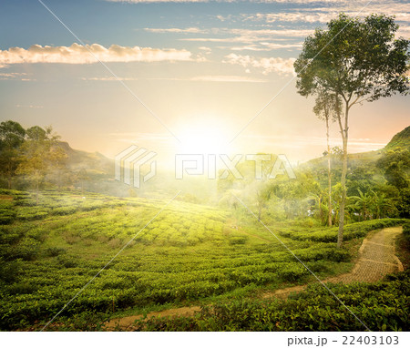 Tea plantations in Nuwara Eliya at sunset. Travels in Sri Lanka.