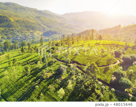 Aerial view of hills with tea plantation misty morning in Sri Lanka.