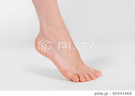Barefoot and legs isolated on white background. Closeup shot of healthy beautiful female feet. Health and beauty concept. Side view of human foot ream with neutral manicure or pedicure. Sole of foot.