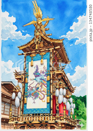 豪華絢爛な装飾された屋台 高山祭 水彩画 ペン画