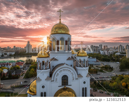 Autumn Yekaterinburg and Temple on Blood in beautiful clear sunset. Aerial view of Yekaterinburg, Russia. Translation of the text on the temple: Honest to the Lord is the death of His saints.