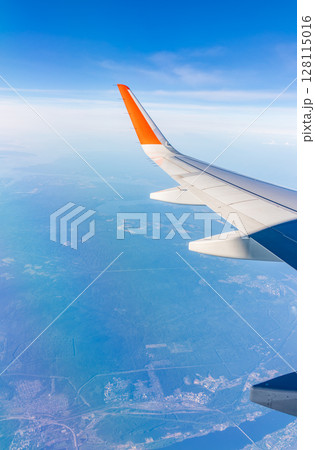 Aerial view from airplane window above green ground. View from the airplane window with beautiful clouds at sunrise