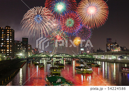 花火 屋形船と隅田川花火大会 (合成イメージ)