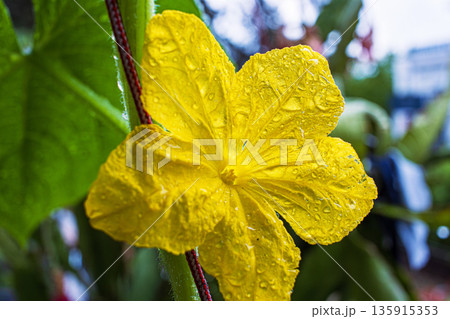 Yellow cucumber flower with water droplets. Macro shot of fresh bloom in urban balcony garden