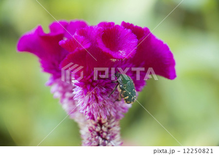紫のケイトウとコアオハナムグリ