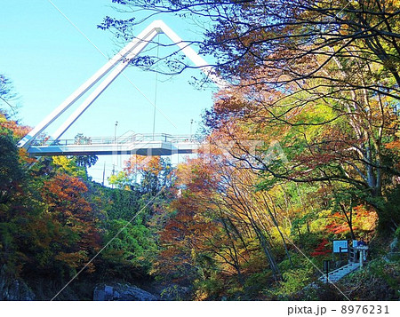 群馬県みどり市大間々町 高津戸峡はねたき橋と紅葉と遊歩道入口