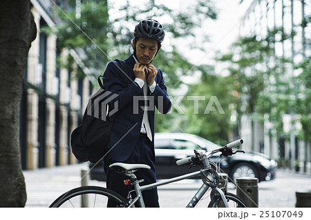 ロードバイクの脇でサイクリンググローブをはめる若い女性