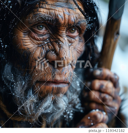 A lifelike representation of an early human stands in a snowy landscape, gripping a wooden spear while showcasing intricate facial details that reflect life in a harsh winter environment.