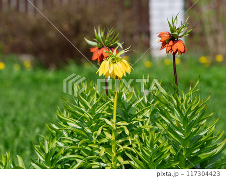 Beautiful Fritillaria imperialis flower on green background. Crown imperial, imperial fritillary perennial plant.