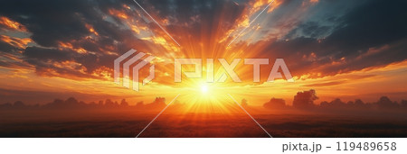 Golden sunrise illuminating the horizon over misty fields at dawn in a tranquil rural landscape