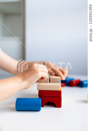Little girl hands playing with eco game. Game for visually displaying emotions, ssensory processing disorder, activities Montessori.