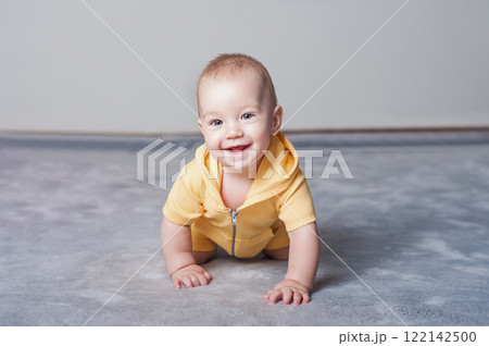 Smiling Baby in a Yellow Outfit Crawling on the Floor