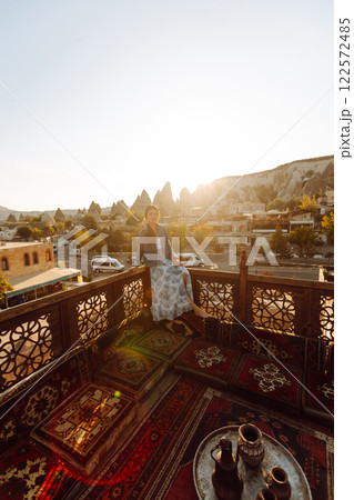 Young woman meditates on terrace with stunning city views in Cappadocia. Concept of active lifestyle
