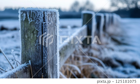 A row of old wooden fence posts stands in a tranquil winter setting, adorned with frosty crystals, as the early morning light gently illuminates the quiet landscape, showcasing nature's beauty.
