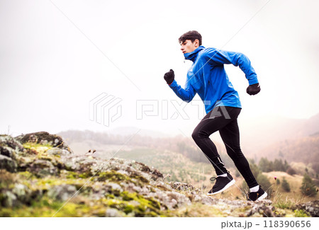 Male runner jogging in nature on dirt running trail. Morning running training for young man.