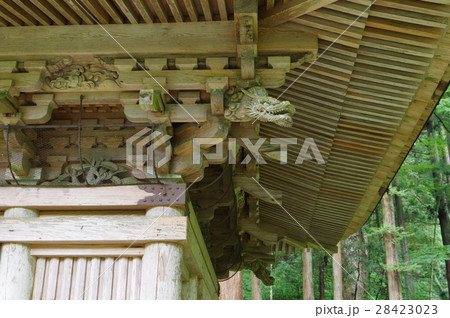 信州 駒ヶ根の寺院 光前寺 三重塔 軒先の彫刻群(800年頃創建の古刹 霊犬早太郎伝説で有名)