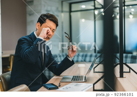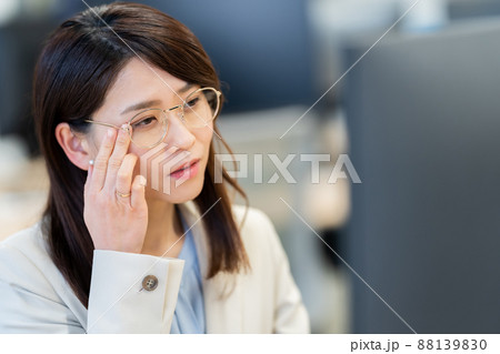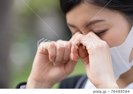 違和感を感じて目を擦るマスク姿のビジネスウーマン