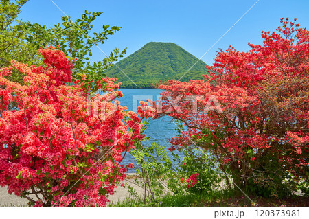 春の群馬県高崎市の榛名湖畔からツツジと榛名富士方面を見る
